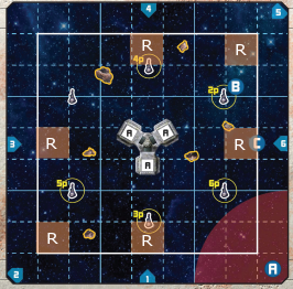 Finally place 6 Asteroids inside zone C at range >= 1 from each other and not overlapping the Refueling Station or any Satellite Relays and not directly in front of any reinforcement vector (Orange zones marked R).