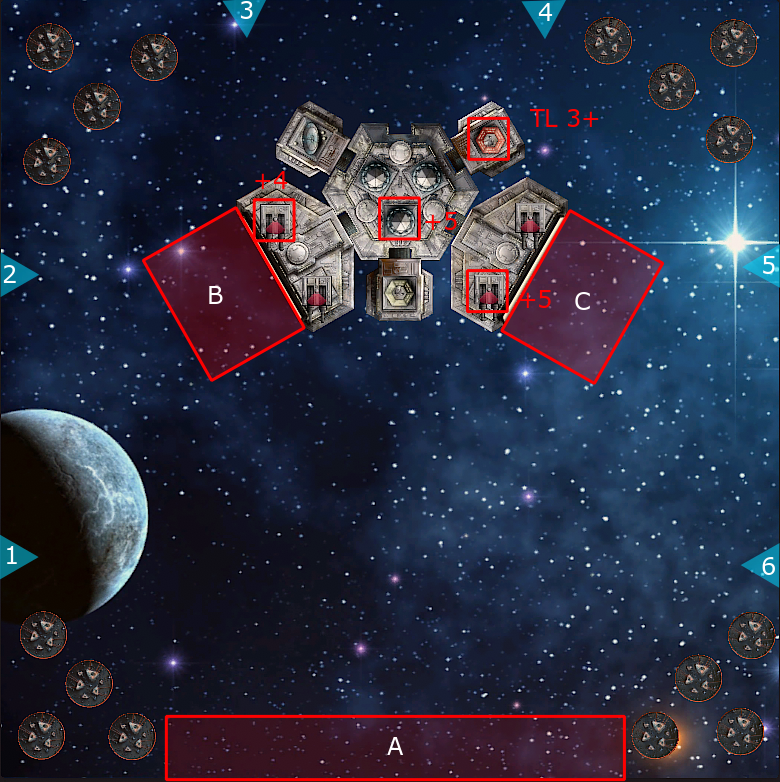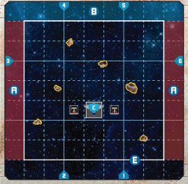 Setup: The Defector’s Shuttle and escorts are placed facing away from board edge B. Player’s setup in zone A. Place 6 asteroids in zone E, >= range 1 of each other and not in the range 1 zone in front of the shuttle or escorts.