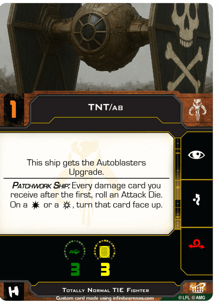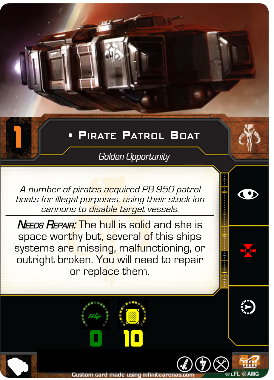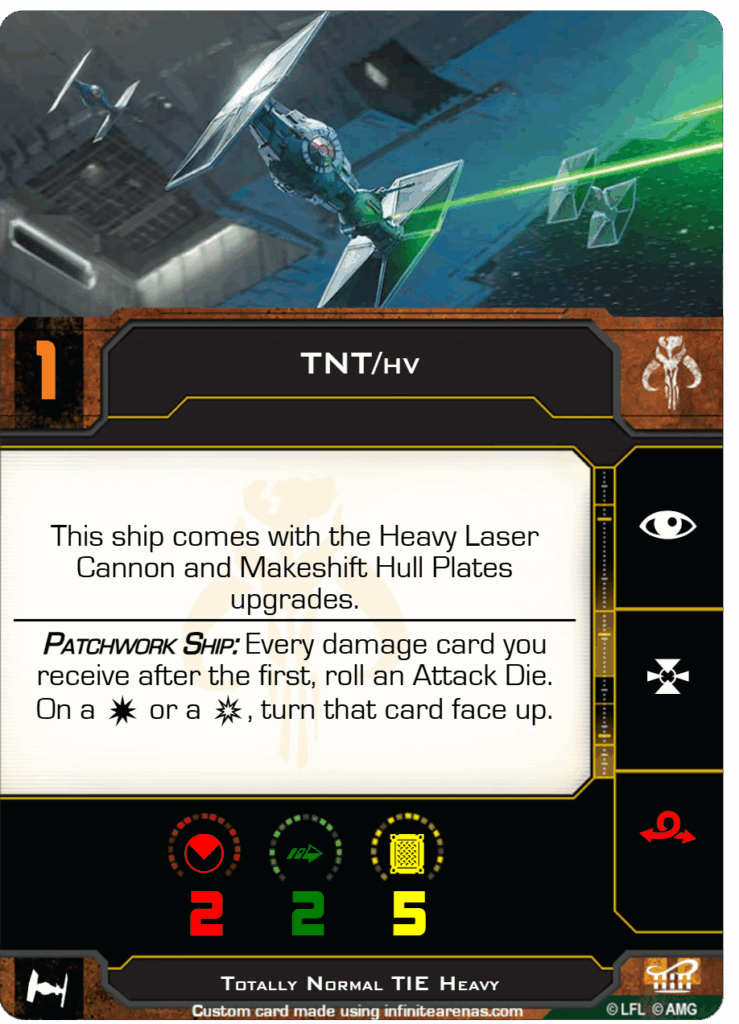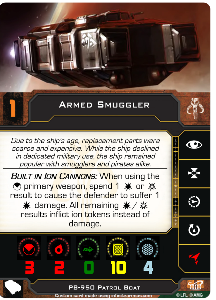 The custom ship and upgrade cards as well as maneuver cards for ships that did not have them from HotAC were created using the excellent site infinitearenas. Many thanks to JimBob there for responding quickly to fix a few bugs and add features that helped in creating custom components. Go support him there if you enjoy the EU ships and custom upgrades.