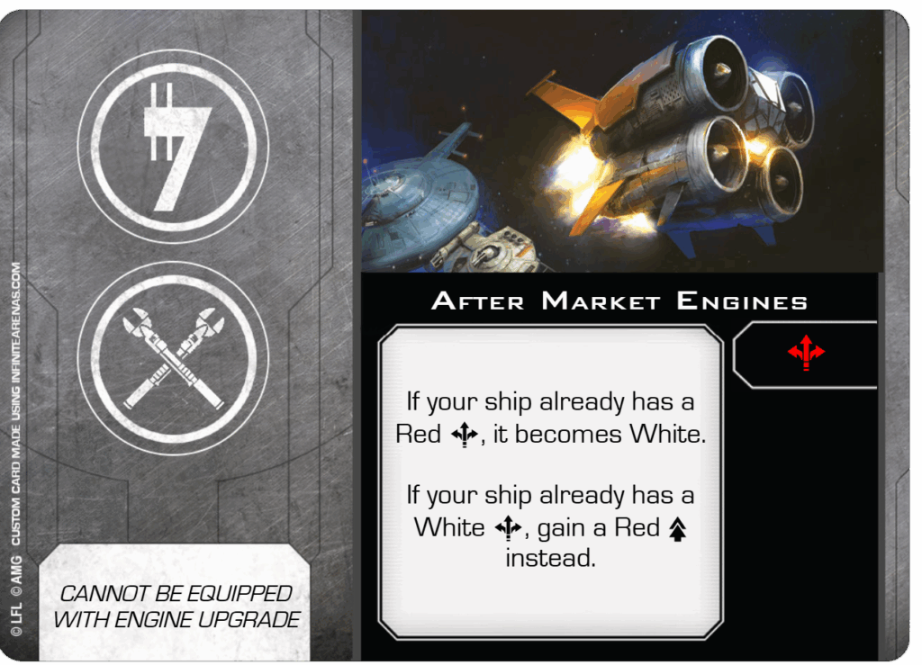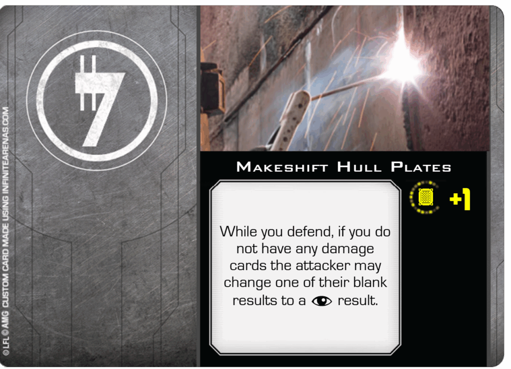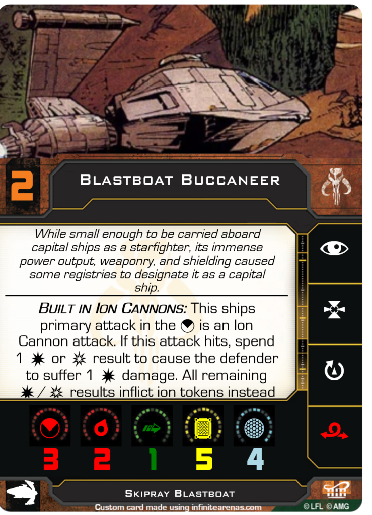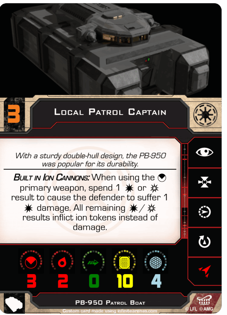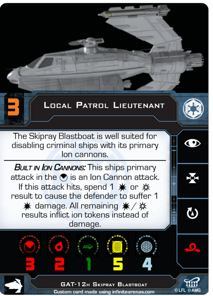 The custom ship and upgrade cards as well as maneuver cards for ships that did not have them from HotAC were created using the excellent site infinitearenas. Many thanks to JimBob there for responding quickly to fix a few bugs and add features that helped in creating custom components. Go support him there if you enjoy the EU ships and custom upgrades.