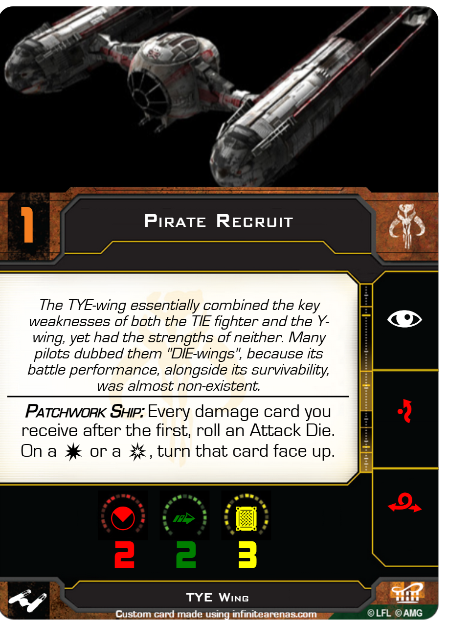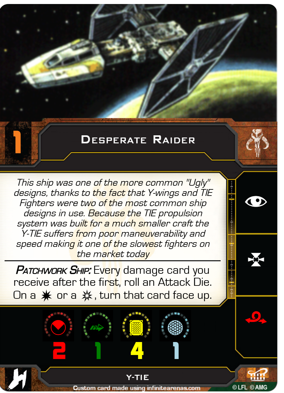 The TYE-Wing is a combination of a TIE Fighter cockpit and sensor package and Y-Wing weapons and engines. The other thing it combines is their weaknesses. Slow as a Y-Wing with the low survivability of the TIE. The only good thing about the TYE-Wing is that it is cheap. While usually good enough to deal with most civilian ships, it falls short when facing front line fighters.
