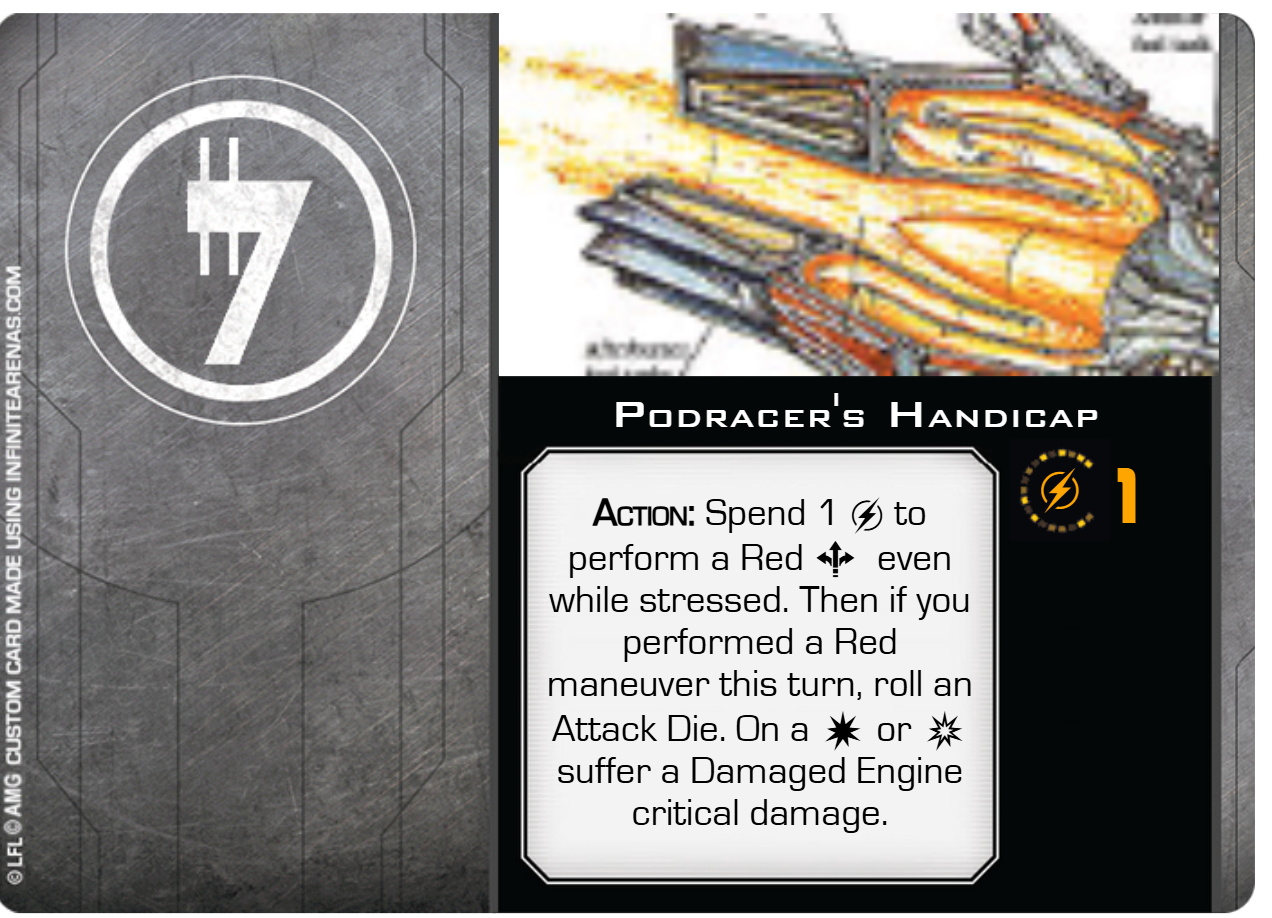 | Notorious | 5 | 2 Charge ^ | After you defend, if the attacker is in your firing arc, you may spend 1 Charge. If you do, the attacker gains 1 strain token. While you perform an attack, if the defender is strained, you may reroll 1 blank result. |