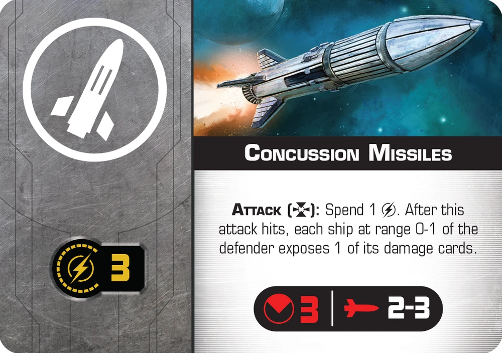 | Saturation Salvo | 3 | While you perform a Torpedo or Missile attack, you may spend 1 Charge from that upgrade. If you do, choose two defense dice. The defender must reroll those dice. | |