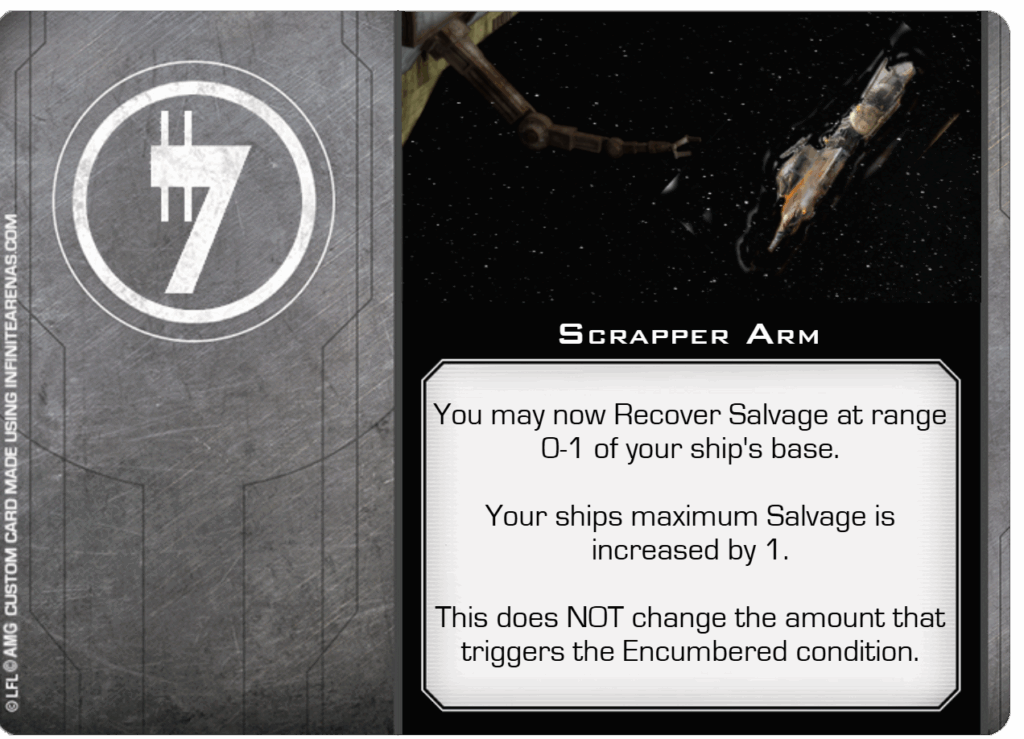 | Ensnare | 17 | At the end of the Activation Phase, if you are tractored, you may choose 1 ship in your turret arc at range 0-1. Transfer 1 tractor token to it. | |